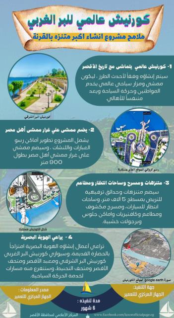 اعلن المستشار مصطفي ألهم محافظ الأقصر، البدء في انشاء الكورنيش الجديد، الذي سيكون تحفة فنية فريدة من نوعها تتماشي مع تاريخ وحضارة الأقصر، حيث سيتم انشاء الكورنيش وفقاً لاحدث الطرز الحديثة، ليكون ممشي ومزار سياحي عالمي يخدم المواطنين وحركة السياحة ويعد