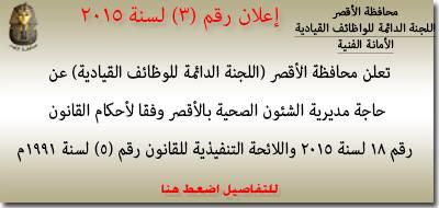 تعلن محافظة الاقصر (اللجنة الدائمة للوظائف القيادية) عن حاجة مديرية الشئون الصحية بالاقصر لشغل احد الوظائف القيدية بمجموعة وظائف الادارة العليا بدرجة مدير عام بموازنة مديرية الشئون الصحية بالاقصر وفقا لاحكام القانون رقم 18 لسنة 2015 وهي مدير عام الادارة العامة لطب الاسنان